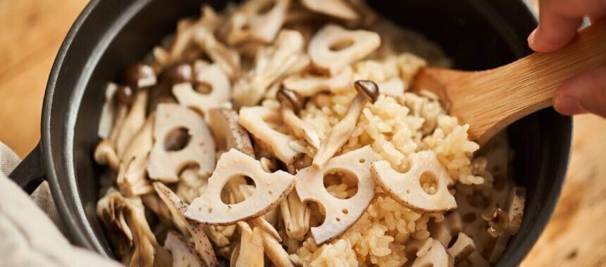 きのこのうま味とレンコンの食感が楽しいこちらの炊き込みご飯。みそで味つけをすることで、きのこのうま味が引き立ち、コクが一気にアップします。