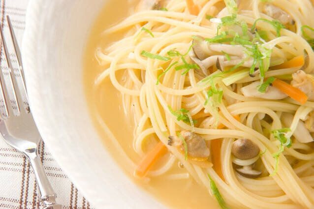 殻付きのアサリ、しめじやにんじんなども入った、スープスパゲティのレシピ。お塩やバターも効いた、ほっこりとしたおいしさ、温かさが体にしみわたりそうです。ネギをちらして華やかに仕上げます。