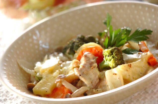 しめじをつかった、みそシチューのレシピです。みそを加えることで、コクと旨味がアップし、きのことの相性もぴったりな和洋風なシチューになります。寒い季節に食べたくなるような一品です。
