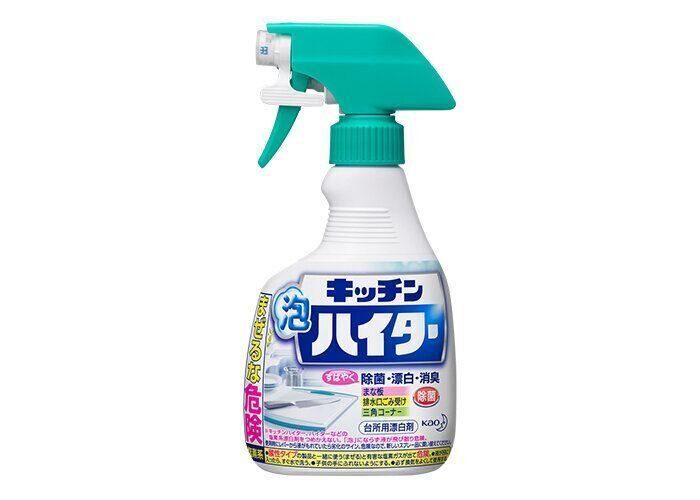 「キッチン泡ハイター」はスプレータイプの塩素系漂白剤。まな板や排水口のごみ受け、三角コーナーなど、気がついた時にシュッシュッとスプレーするだけ。とくに、急須や水筒など、細かなところにも大活躍。漂白だけでなく、除菌※や消臭にも効果があり、プラスチック製まな板、排水口のごみ受けなら、たった30秒でスッキリキレイに。
