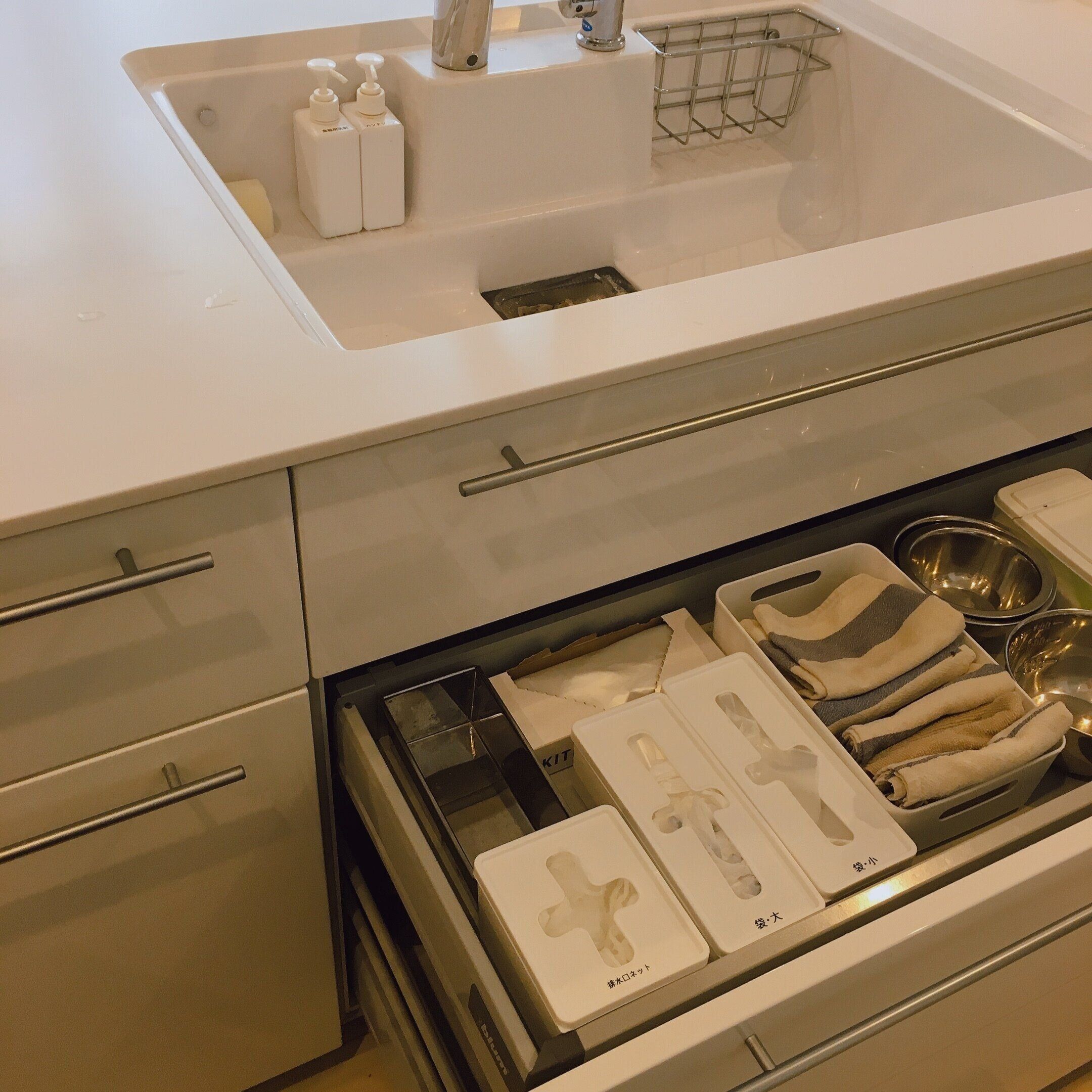 収納する場所はシンクのすぐ近く。セリアで購入したプルアウトボックスに収納しています。