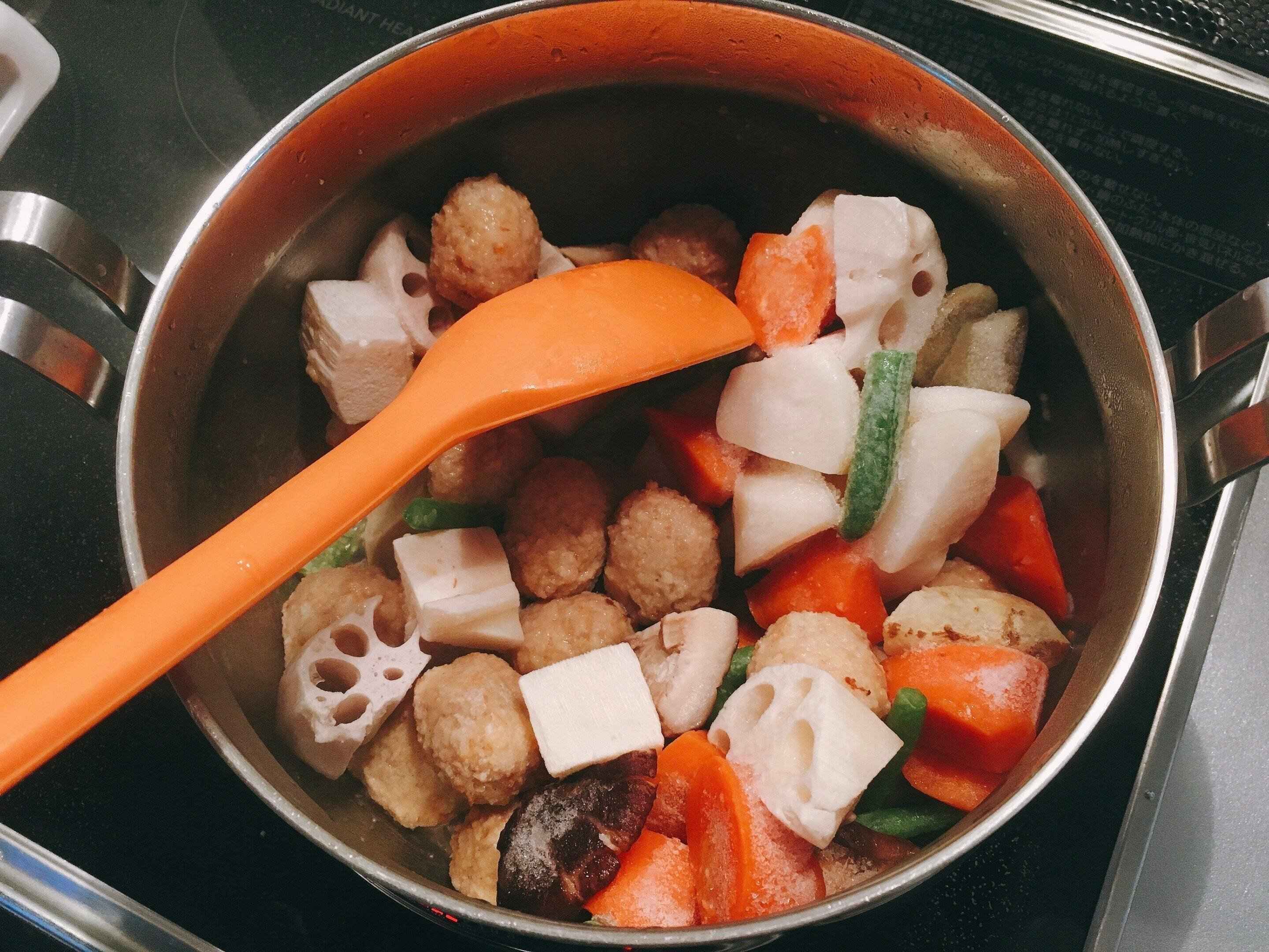 煮物に使う和風野菜をカレーに入れるおいしいということはつくって初めて知りました。パッケージに「アレンジいろいろ。カレーに」と書かれていなかったら挑戦しなかったと思いますが、野菜のゴロゴロ感が満足度を高めてくれるのです。この場合は、肉も野菜に負けないボリュームがある肉団子を使うのがオススメです。