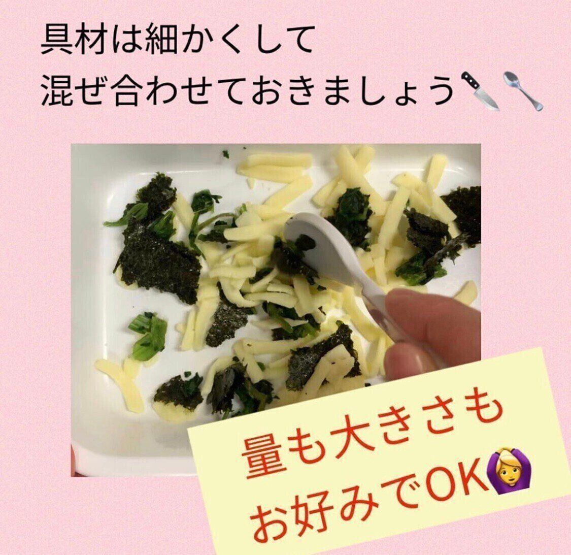 ちぎった海苔とピザ用チーズ、こまかくしたほうれん草をスプーンで混ぜておきます!