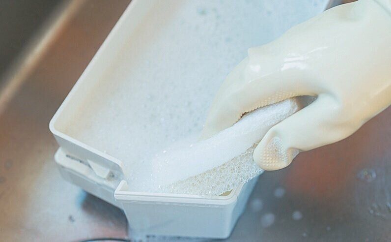 冷凍食品や生鮮食品は、クーラーボックスに移しながら進める。はずせるパーツは、食器用洗剤をつけたスポンジで洗い、マイクロファイバークロスで拭き上げる。