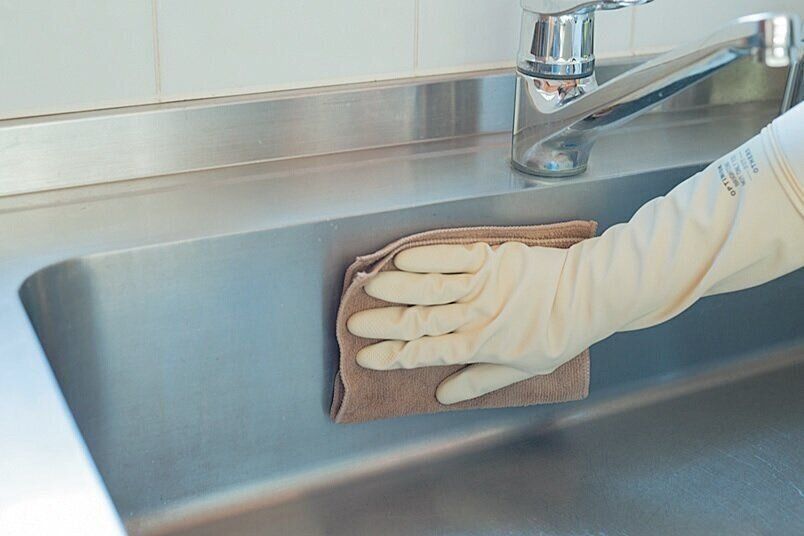 水で流したパーツやシンクは、吸水性のいいマイクロファイバークロスを使って、から拭きして仕上げる。シンク内は、ステンレスのヘアラインに沿ってから拭きをすること。