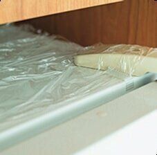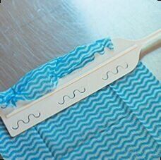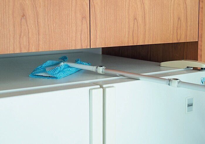 フロアワイパーにウエットダスターをセットし、冷蔵庫の上を拭く。キレイなったらラップをかけてマスキングテープで留めておけば、次回からはラップを交換するだけでOK。