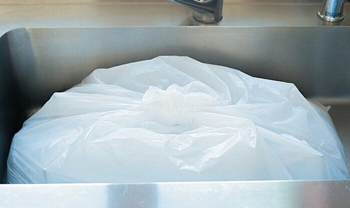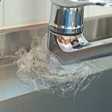 水きりかごなどはゴミ袋2枚を重ね40~50℃の湯、クエン酸大さじ1を入れつけ置き(蛇口はクエン酸をペースト状にして塗りラップ)。30分後、水で流しあみたわしでこする。