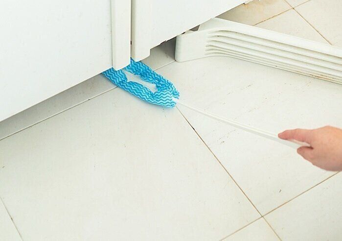 すき間ワイパーにウエットダスターをセット。冷蔵庫の下の前面についているカバーをはずし、ワイパーでほこりをかき出す。ダスターを取り換えて、キレイになるまで拭く。