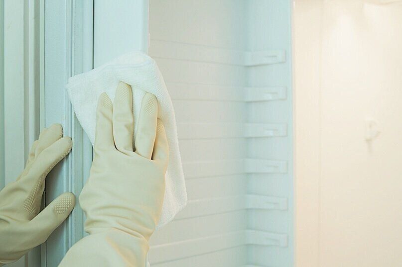 マイクロファイバークロスにアルコール除菌水を吹きつけて、庫内全体を拭く。調味料がこびりついた汚れなどは、湯でゆるませてから拭くと落ちる。