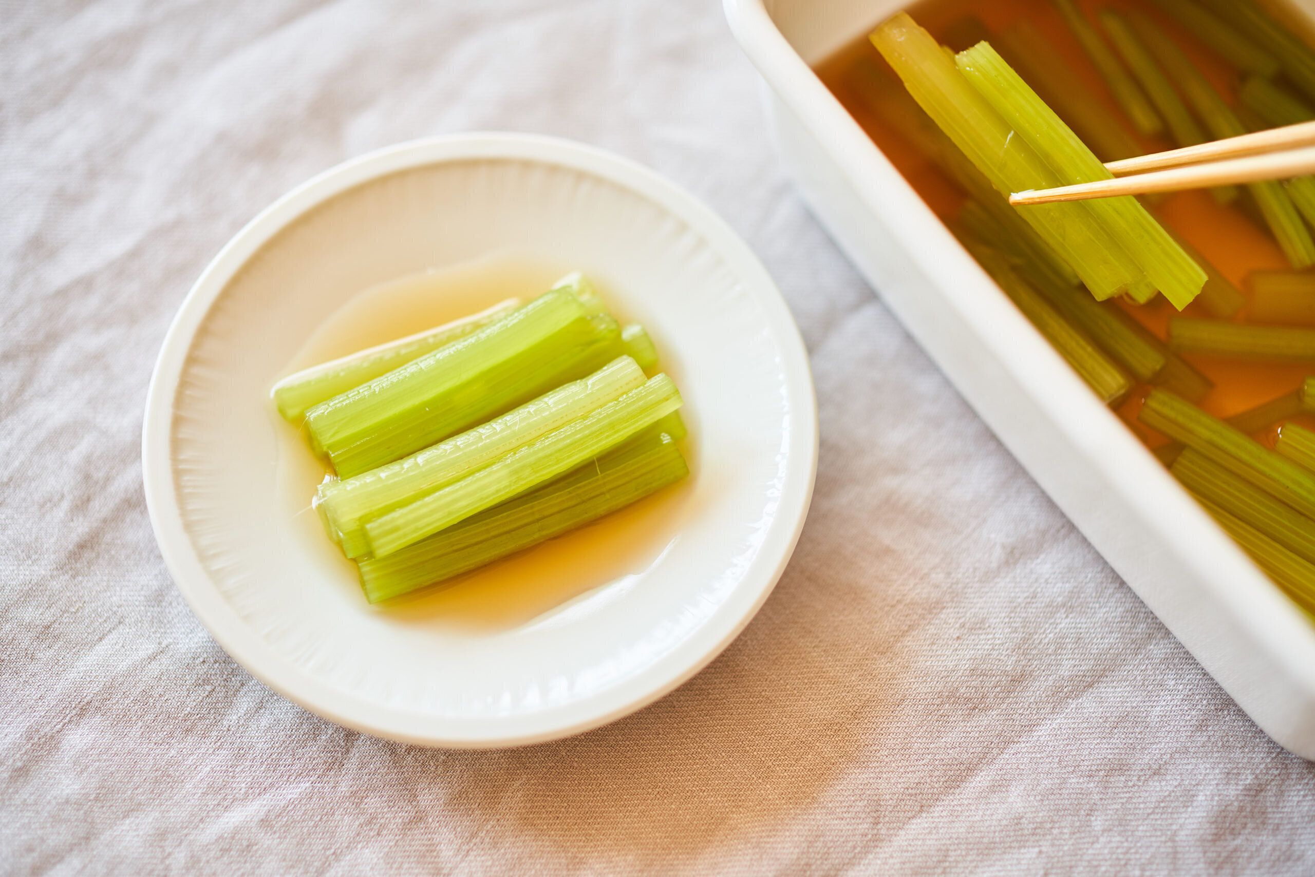 ふき本来の鮮やかなグリーンがおしゃれなマリネレシピ。ほろ苦さが残るさわやかな味わいです。酢とオリーブオイルを混ぜたマリネ液に、翌日までしっかり漬けることをおすすめします。
