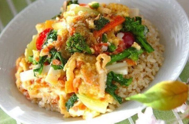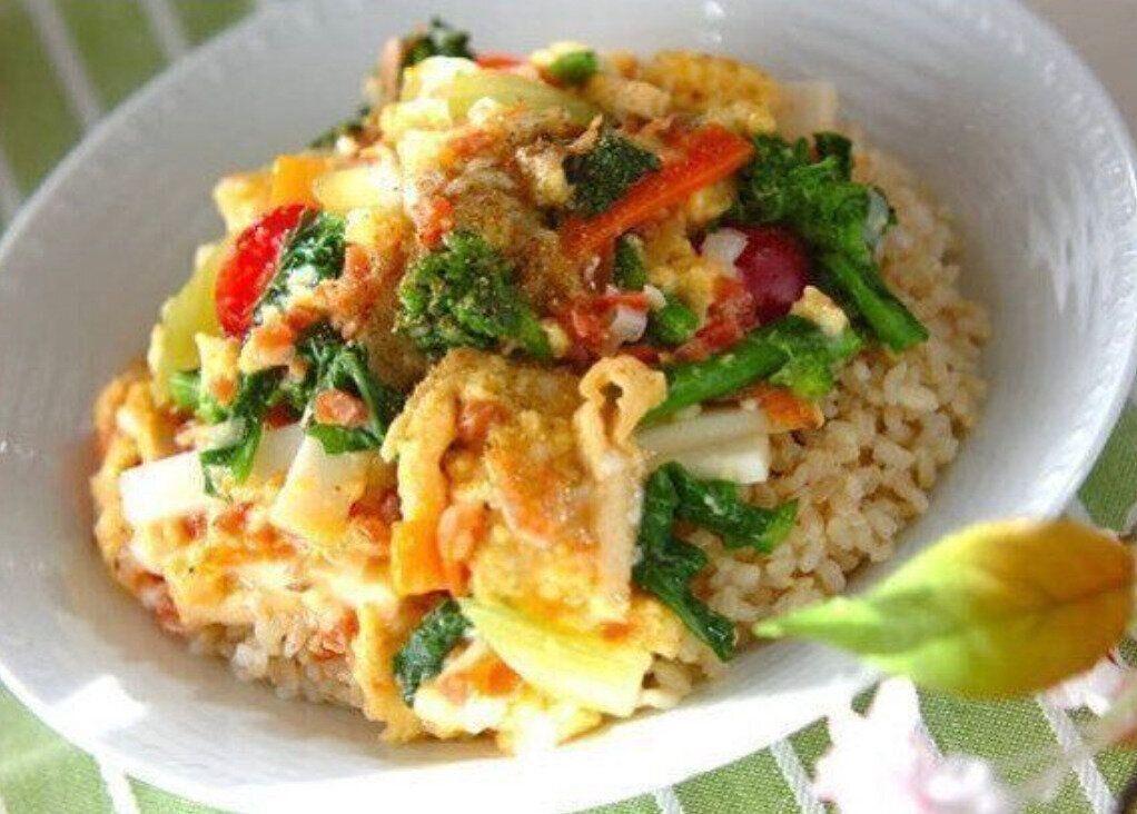 ふきのほかに、ウドや菜の花など春の食材をたっぷりつかった卵とじ丼のレシピです。香り豊かで春野菜の食感もしっかり楽しめます。アクセントにカリカリ梅を入れることで、味と食感に変化が出ます。