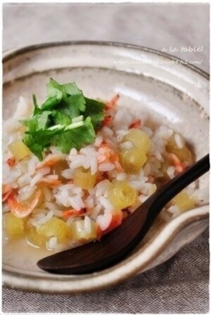 ふきと桜海老をたっぷり使った和風リゾットレシピ。かつおのだしがベースのやさしい味わいです。お米とふきをいためてから、時間をかけてじっくり炊きあげます。桜海老の香りが味に深みを出してくれますよ。