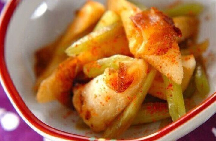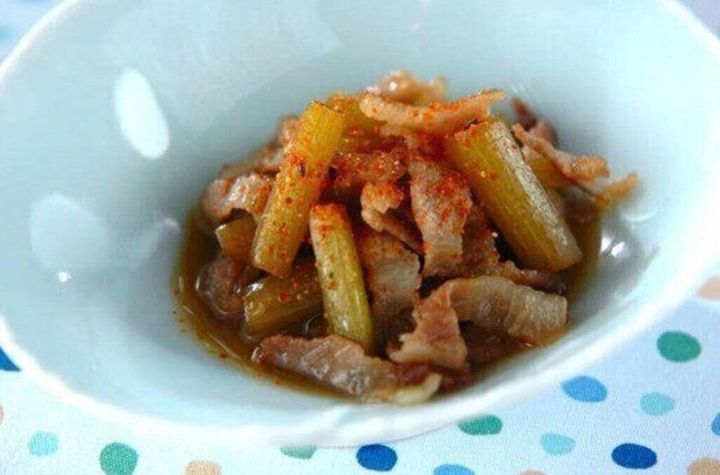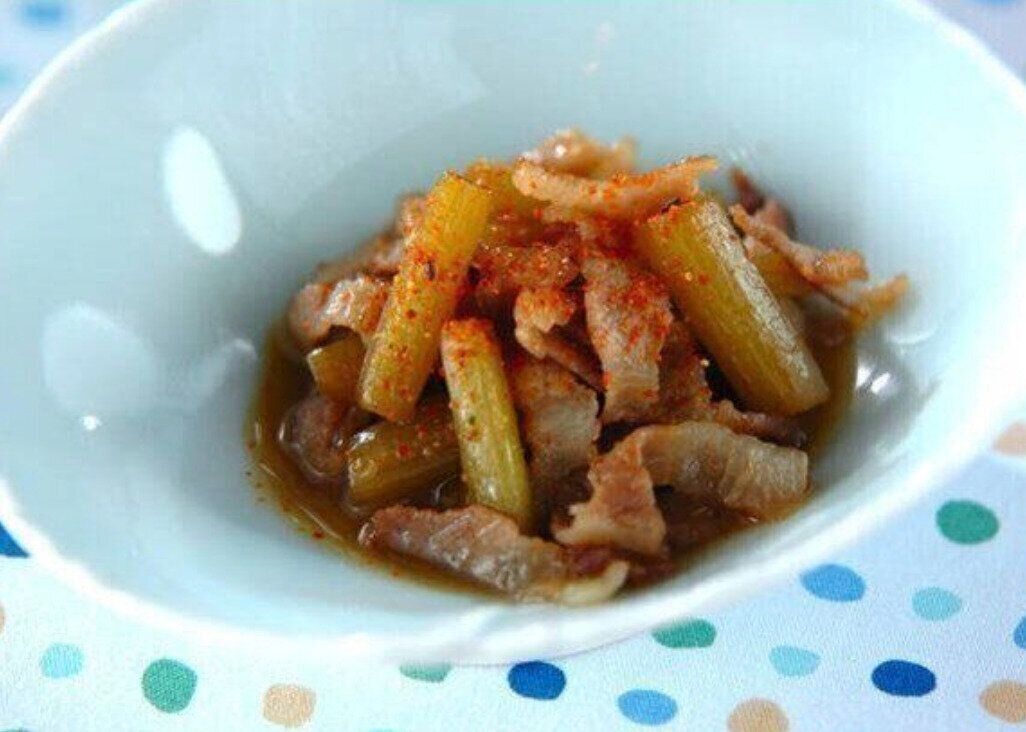 薄切りの豚ばら肉とふきを炒めたきんぴらです。ふきの程よい苦味も残しつつ、豚肉の旨みをしっかり含んでお箸が進みます!仕上げに一味唐辛子をかけると、辛さが味のアクセントになります。