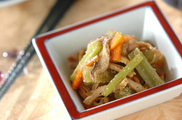 ふきのシャキシャキとした歯応えがおいしいごまあえ。しいたけのうま味やすりごまの風味がよくからんでいます。にんじんのオレンジとふきの緑で彩りがよく、お弁当にもおすすめの一品です。