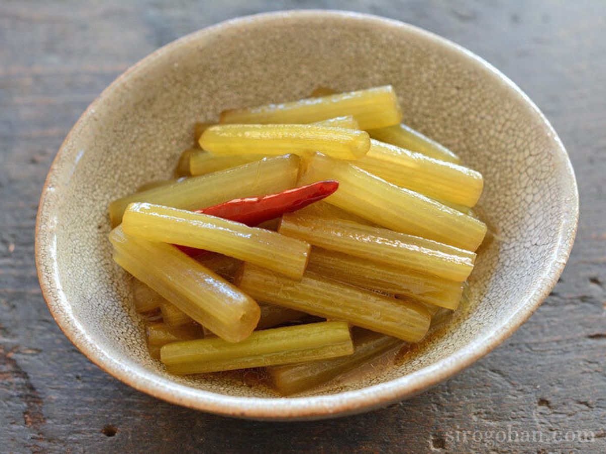 濃い目に味を付けていて、ご飯によく合うふきの佃煮。しっかりと調味料とともに煮込んでつくります。お弁当の隙間スペースを埋めるのにもぴったりです。ふきはゆでたあと、1時間ほど水に漬けておくのがポイント。