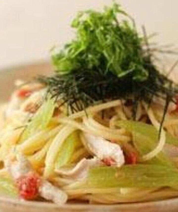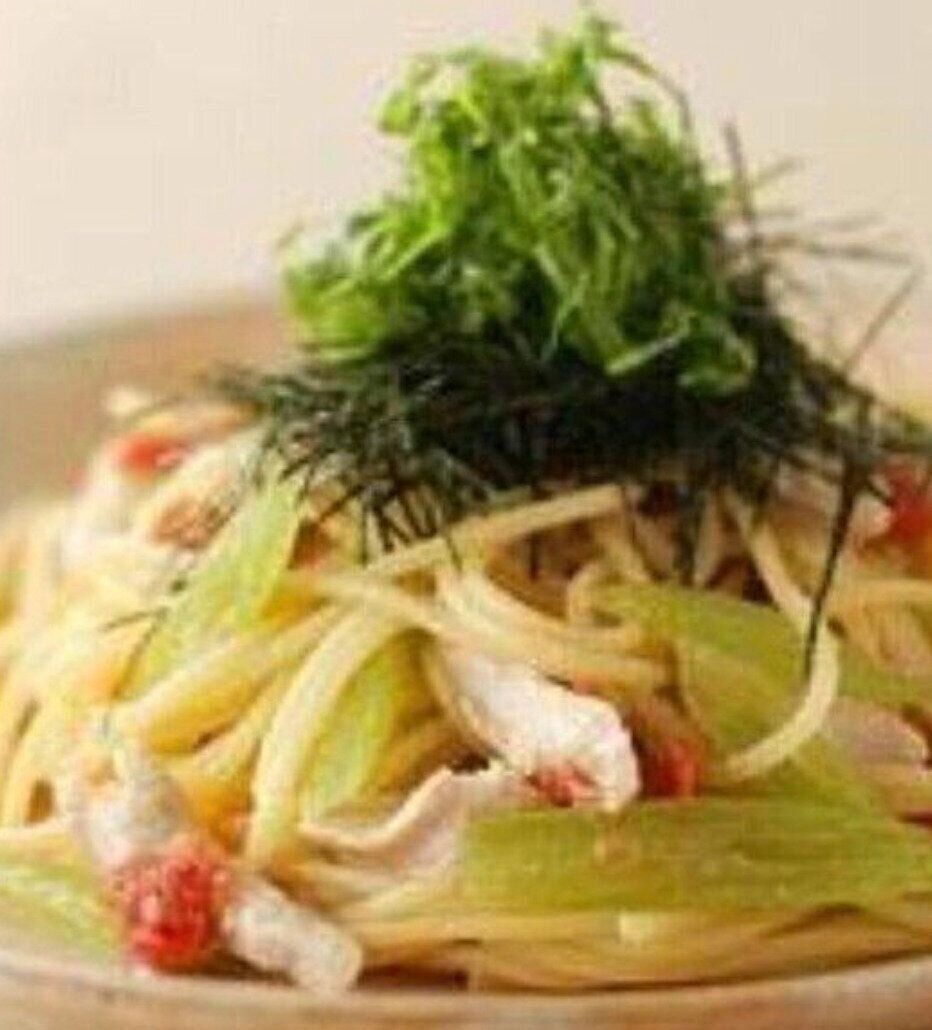 和食の印象がつよいフキを、さっぱり梅風味のパスタと合わせた一品です。フキを具材に入れることで、柔らかいささ身と、フキのシャキシャキとした食感の違いを楽しめます。