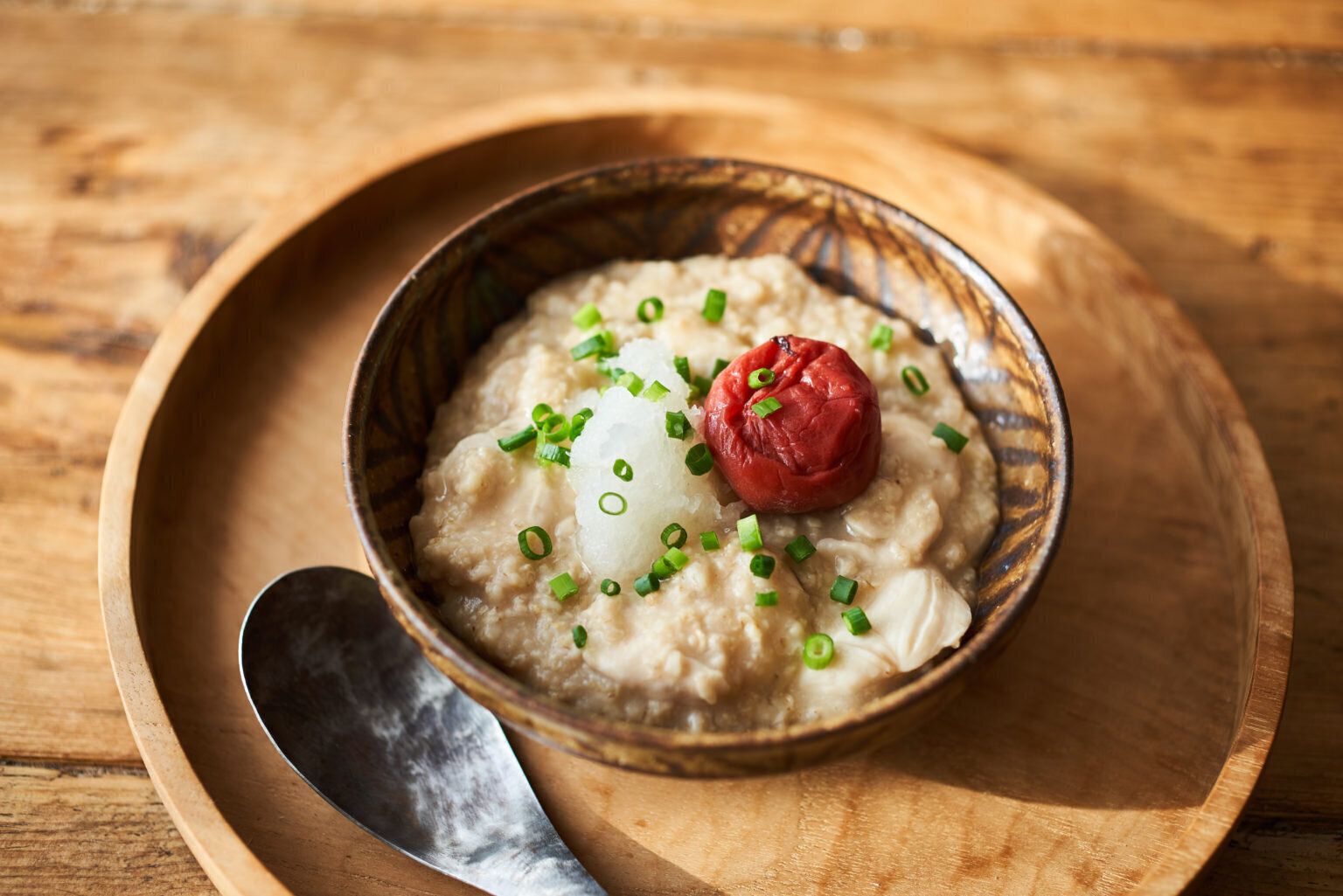 軽くごはんをすませたいときにぴったりの、オートミールを使ったささみの梅おろし雑炊。ささみのタンパク質もうれしいメニューです。あっさり、さわやかな味つけでスルスルと体に入っていきそうですね。