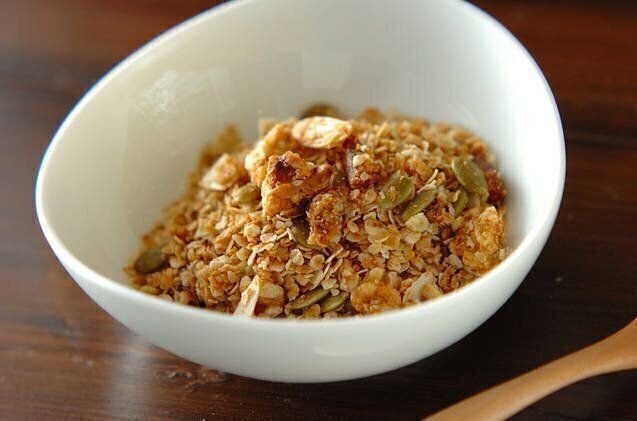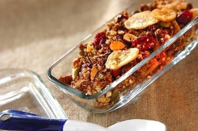 オートミールにナッツやドライフルーツなどを加えた、自家製グラノーラのレシピです。ほんのりした甘さと香ばしさがたまりません。つくり置きしておくと、朝ごはんやお菓子づくりなどに活用できますね。