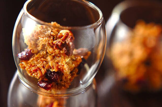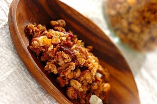 そのままでもおいしい大豆入りグラノーラ。オートミールのほか、大豆やクルミも入っていますよ。たっぷりつくって保存しておけば、朝食や小腹が空いたときに◎。ヨーグルトや牛乳とも合わせてみてくださいね。
