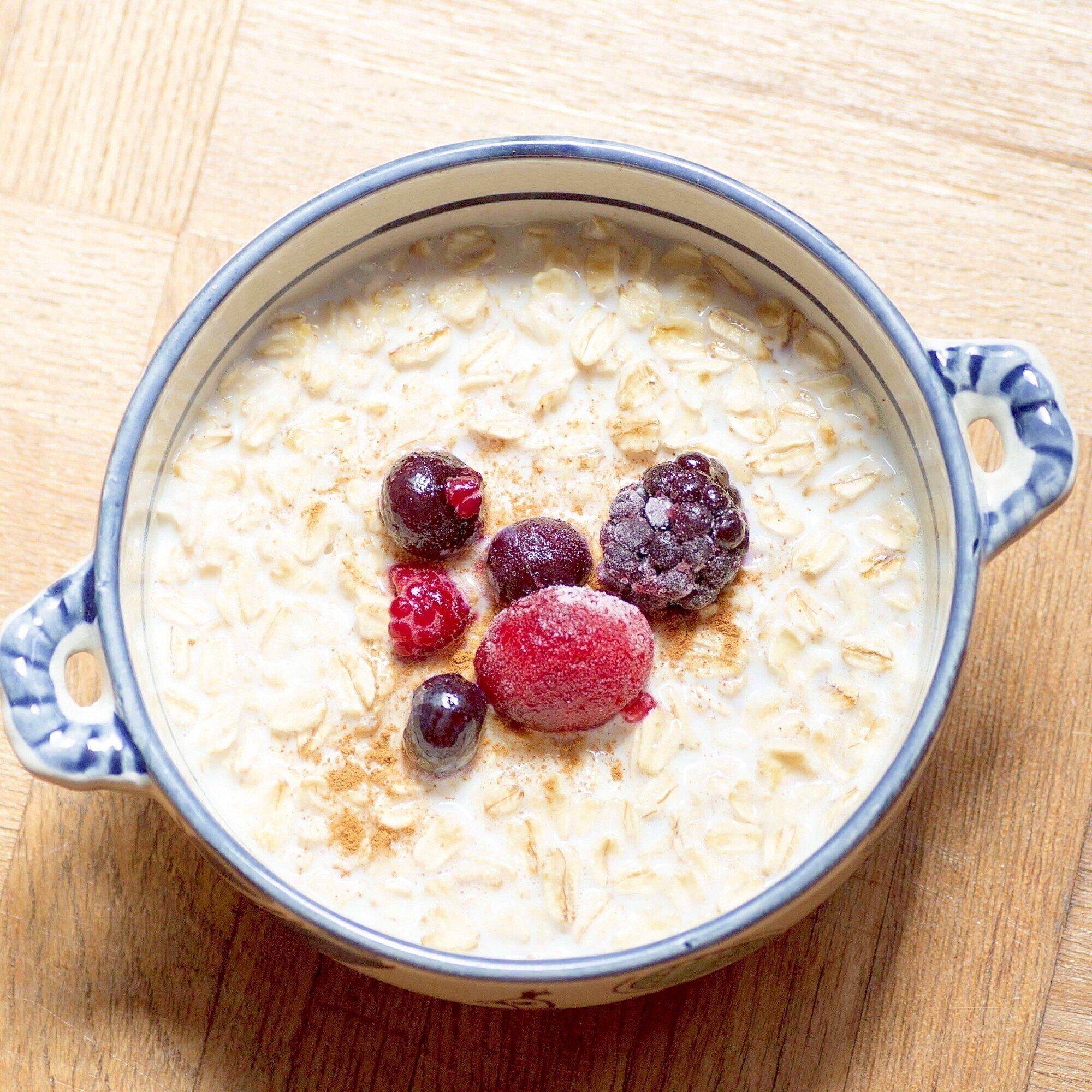 オートミールを相性のいい牛乳といっしょに煮込んだ、優しい味わいのミルクがゆレシピ。シナモンをちょっぴりプラスすると、風味がアップします。ベリーミックスをトッピングすれば、色合いも◎。