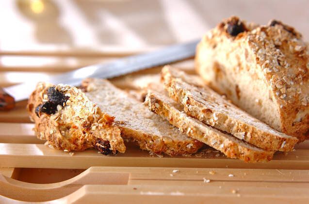 ドライイチジクとクルミがいいアクセントになっている、グラハムブレッドのレシピ。パンを焼く直前に、オートミールを振りかけるのがポイントです。発酵不要で混ぜてやくだけなので、気軽に挑戦できますね。