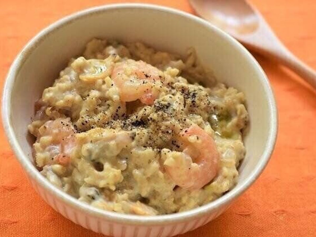 うま味たっぷりのアサリを使った、オートミールがゆのレシピ。アサリやきのこのだしをオートミールがしっかり吸い込み、ヘルシーで栄養たっぷり。とろみがあって食べやすいですよ。