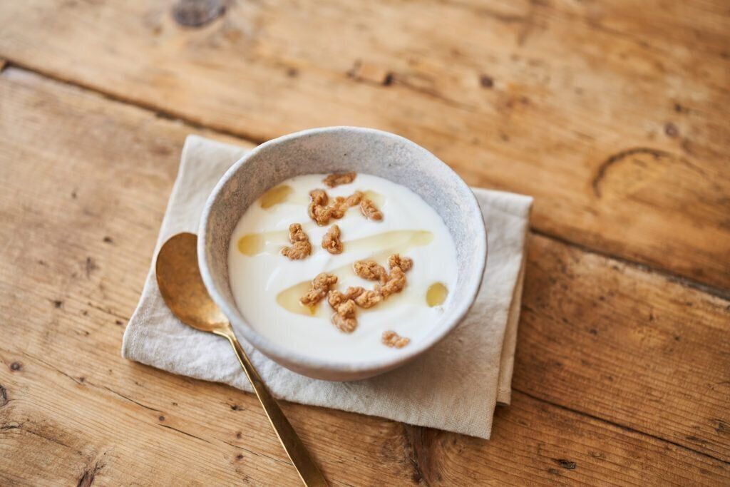 大豆ミートのヨーグルトは、カルシウムとタンパク質が一度に摂れる便利なメニュー。さっぱりしたヨーグルトに、ハチミツの甘さがマッチ。そこにカリカリの大豆ミートが加わって、いいアクセントになっています。大豆ミートは時間が経つとしんなりとしてくるので、食べる直前にかけましょう。