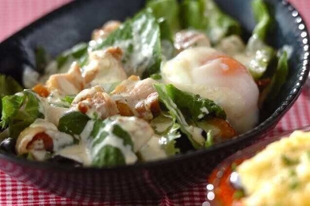 プレーンヨーグルト入りの手作りドレッシングをかけて食べる、シーザーサラダのレシピです。鶏もも肉を加えるので、野菜もお肉もモリモリ食べたいときにぴったり。洋食の副菜におすすめですよ。