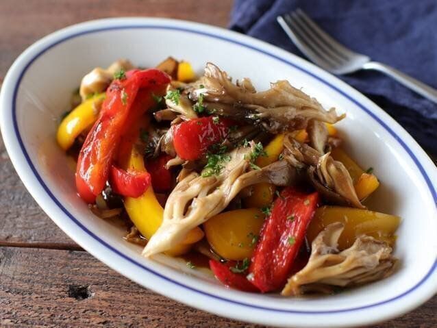 舞茸とパプリカが相性バツグンのマリネです。炒めたら、すぐにバルサミコ酢の液に漬けこんで、味を染み込ませるのがポイント。ほどよい酸味が効いていて、食卓にアクセントをプラスしてくれます。