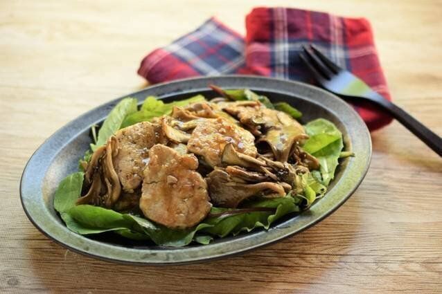 マスタード風味でクセになるソテーレシピ。加熱前の豚肉に舞茸をなじませておくことで、肉がぐっと柔らかい食感になりますよ。ベビーリーフを敷いて盛りつけると、見た目もボリューミーに。