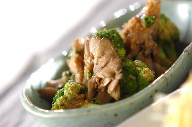マイタケやブロッコリーと、「ゴマみそダレ」の相性を楽しめる和え物レシピです。刻みネギも加えてさっぱりと。電子レンジで手軽に作りやすいのもポイントです。和食の副菜にいかがでしょうか。