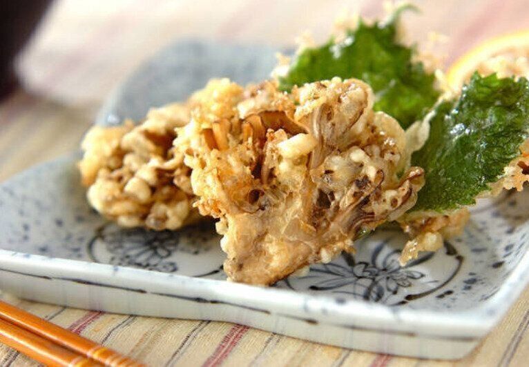 それぞれの香り・風味の調和を楽しめそうな、マイタケと大葉の天ぷらレシピ。小麦粉をしっかりとつけるのがポイントです。お好みの薬味で、味の変化を楽しむのもおすすめですよ。