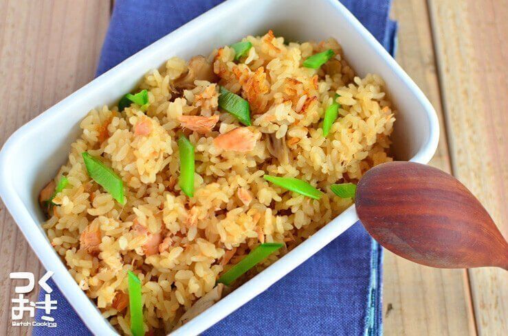 鮭と舞茸を混ぜ込んだご飯レシピです。具材をお米と一緒に炊き込む前に、合わせ調味料にしっかり漬け込んでおくとおいしく仕上がります。塩昆布やごまをふりかけて食べても◎。