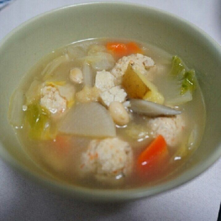 鶏むね肉におからや野菜をたっぷり入れた、鶏団子入りみそ汁のレシピです。さまざまな野菜やお肉も入っているので、この一品だけでもしっかり栄養をとることができそうですね。
