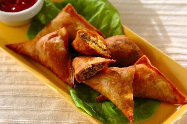 おからやひき肉などの具材を、春巻きの皮で包んだサモサ。皮のパリパリ感や、カレーやチリパウダーのスパイシーな風味も楽しめます。おからは炒めすぎずに、しっとりさを残すのがおいしくつくるコツです。