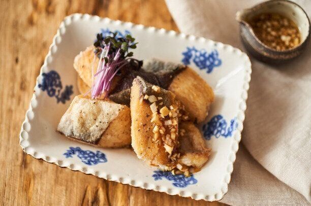カラリとあげたぶりの竜田揚げにたっぷりのねぎだれをかけた一品です。そとはカリカリ、中はふんわりとしたぶりの竜田揚げに旨味たっぷりの香味ねぎのたれが染み込み、ごはんがすすむ一品です。
