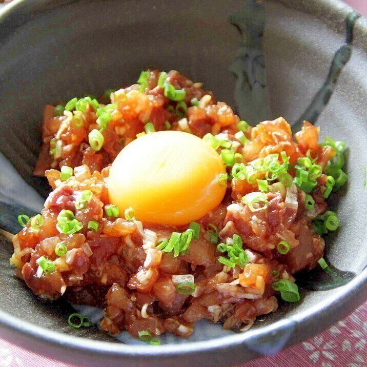 夜ご飯のおかずや、お酒のおつまみとしても活躍する、ぶりのユッケです。ぶりはこまかくしすぎないように、荒みじん切りにすると◎。タレにテンメンジャンを使うのがポイントです。
