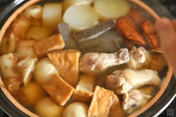手羽元をメインの具材にした、食べ応えのあるおでんレシピです。手羽元のうま味と、かつお節と昆布のエキスが相まって、絶品のスープに。うどんも投入すると、新たなおいしさを楽しめますよ。