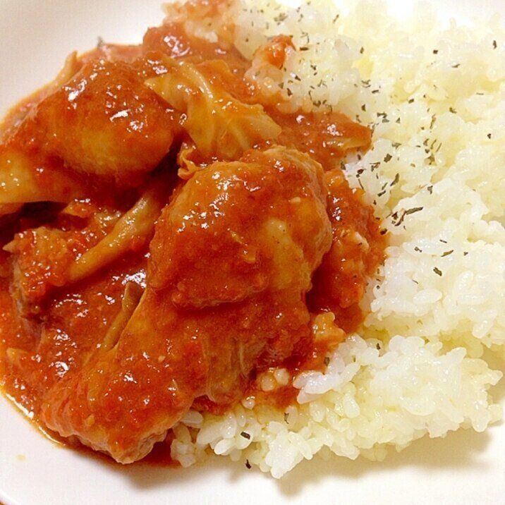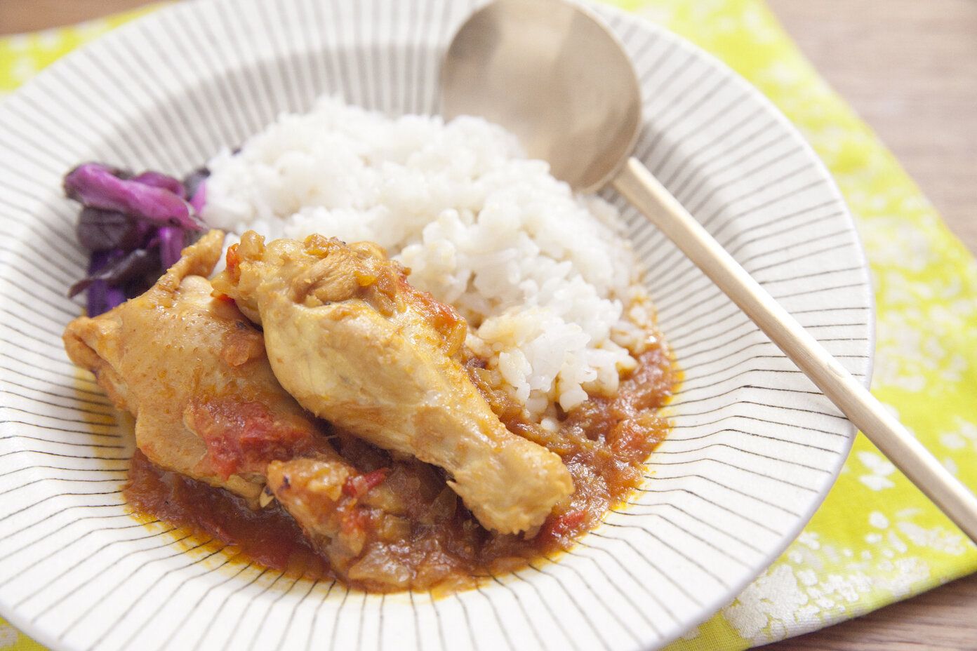 手羽元とキャベツを、トマト缶とともにしっかり煮込んでつくった一品。圧力鍋を使うので、料理時間を短縮でき、さらに手羽元はほろほろになります。ご飯にたっぷりかけて完成です。