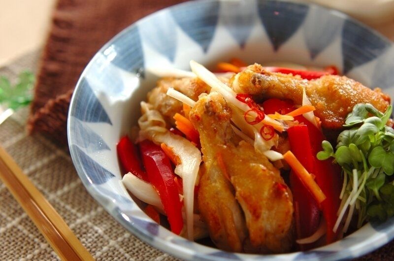 揚げた手羽元に、たっぷりの甘酢をかけてからめた、さっぱりとしながらも食べごたえのある一品です。
