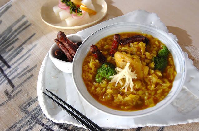 やわらかく煮えた手羽先とスパイシーな香りが食欲をそそる、カレー風味のおじやレシピ。好みでかりんとうをトッピングすると、甘みと食感が加わって新鮮な味わいを楽しめます。