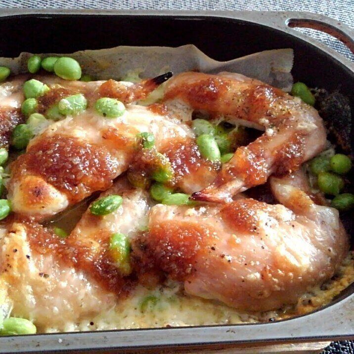 香ばしい風味がたまらない、おつまみにもぴったりなおかずレシピ。チーズと枝豆は後入れすることで、焦げずにおいしく食べられます。手羽先の焼き色が食欲をそそりますね。