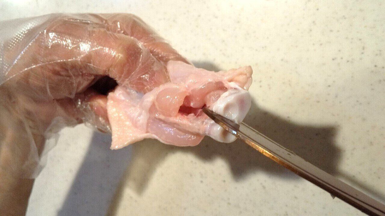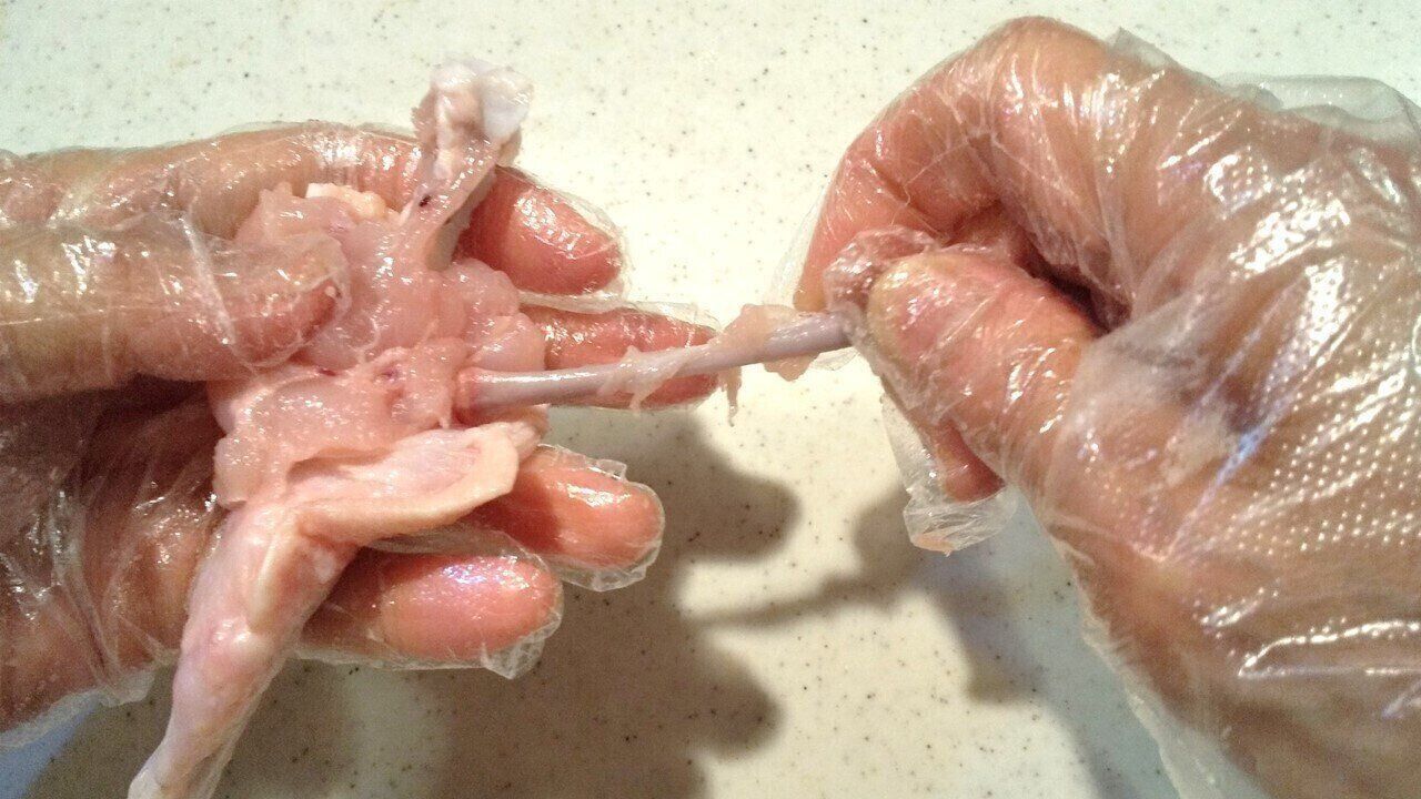 つづいて、キッチンバサミなどを使って、切り口から見える2本の骨の間と、骨に付いている肉を切り離します。