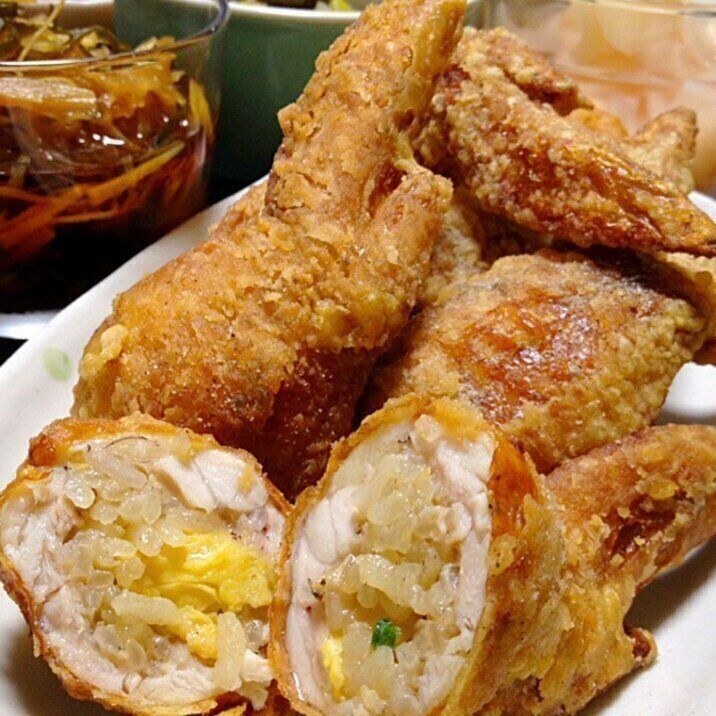 骨を抜いた手羽先に、冷凍食品のチャーハンを詰めたアレンジレシピ。肉のうま味を丸ごと吸収した絶品料理で、おつまみにもぴったりです。チャーハンをカレーピラフやポテトサラダなどにしても◎。