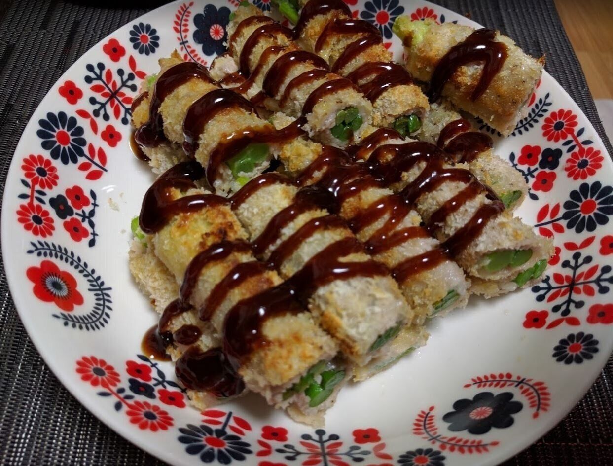 グリルパンで揚げずにつくるヘルシーなニンニクの芽の豚肉巻きのレシピ。焦がさないように、こまめにチェックしながらつくるのが重要です。おこのみソースがよく合います。