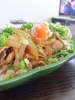 生姜焼きをご飯の上にのせて、温泉卵をトッピングした生姜焼き丼のレシピです。豚肉に米粉をまぶしておきます。生のしょうがすりおろしを使うと、さらにおいしくなりますよ。