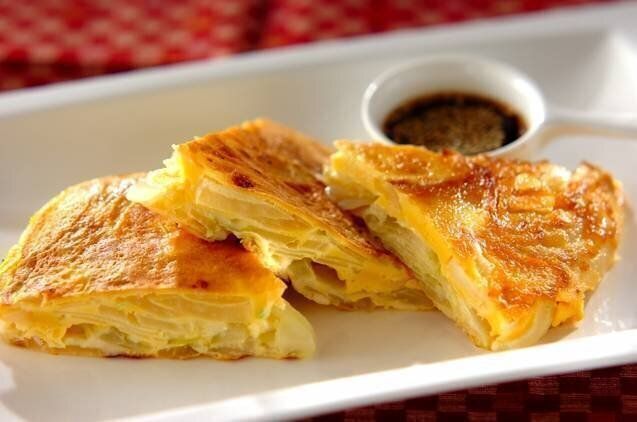 米粉を入れてもちもちっと仕上げる、玉ネギとホタテのチヂミ。ゴマ油の風味もアクセントになりそうです。手作りの「タレ」と一緒にパクパク食べ進められそうな一品。副菜メニューや、おつまみにもぴったりです。