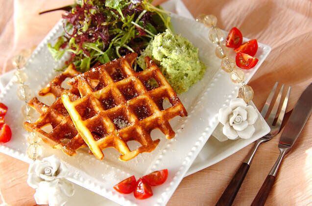 外サク中モチ食感の、米粉ワッフル。ワッフルに粉チーズの風味をプラスした、ランチにもぴったりの一品です。手作りの「アボカドディップ」や野菜も添えて彩り豊かに!味変しながら楽しむのもよいですね。