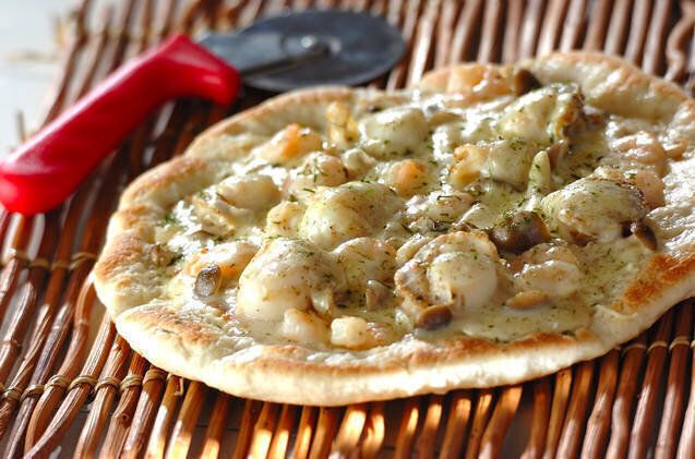 米粉入りのピザ生地でつくるシーフードの白みそホワイトソースピザのレシピ。ホワイトソースと白みそが好相性です。ピザ生地にソースをぬって、お好みのシーフードをトッピングすれば◎。