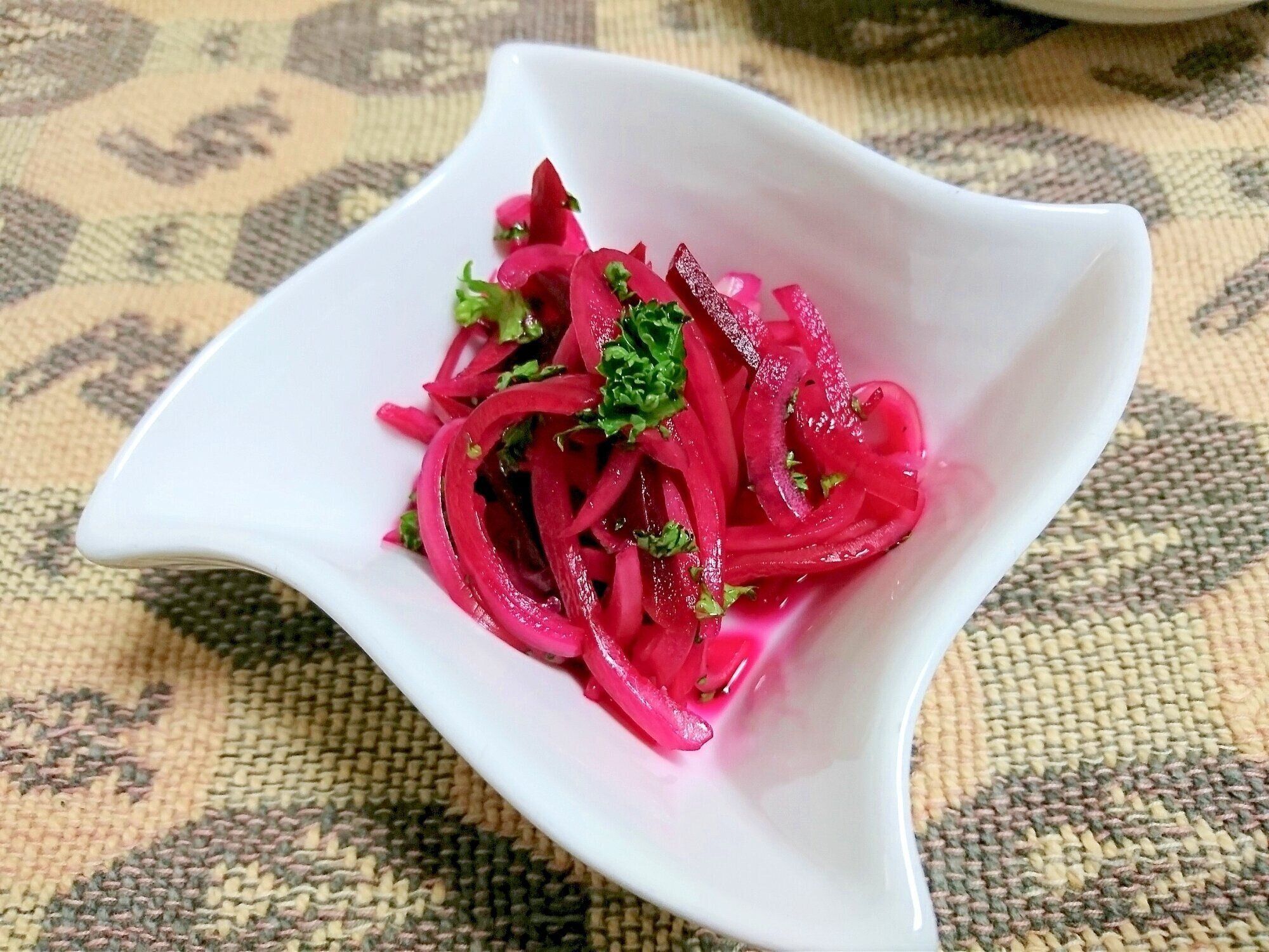 玉ねぎとゆでたビーツを、はちみつと調味酢に漬けるだけの簡単レシピ。ピンクのきれいな彩りと、ほのかな酸味が食欲をそそります。常備菜としてたっぷり漬けておいて、玉ねぎの色合いの変化を楽しむのもいいですね。